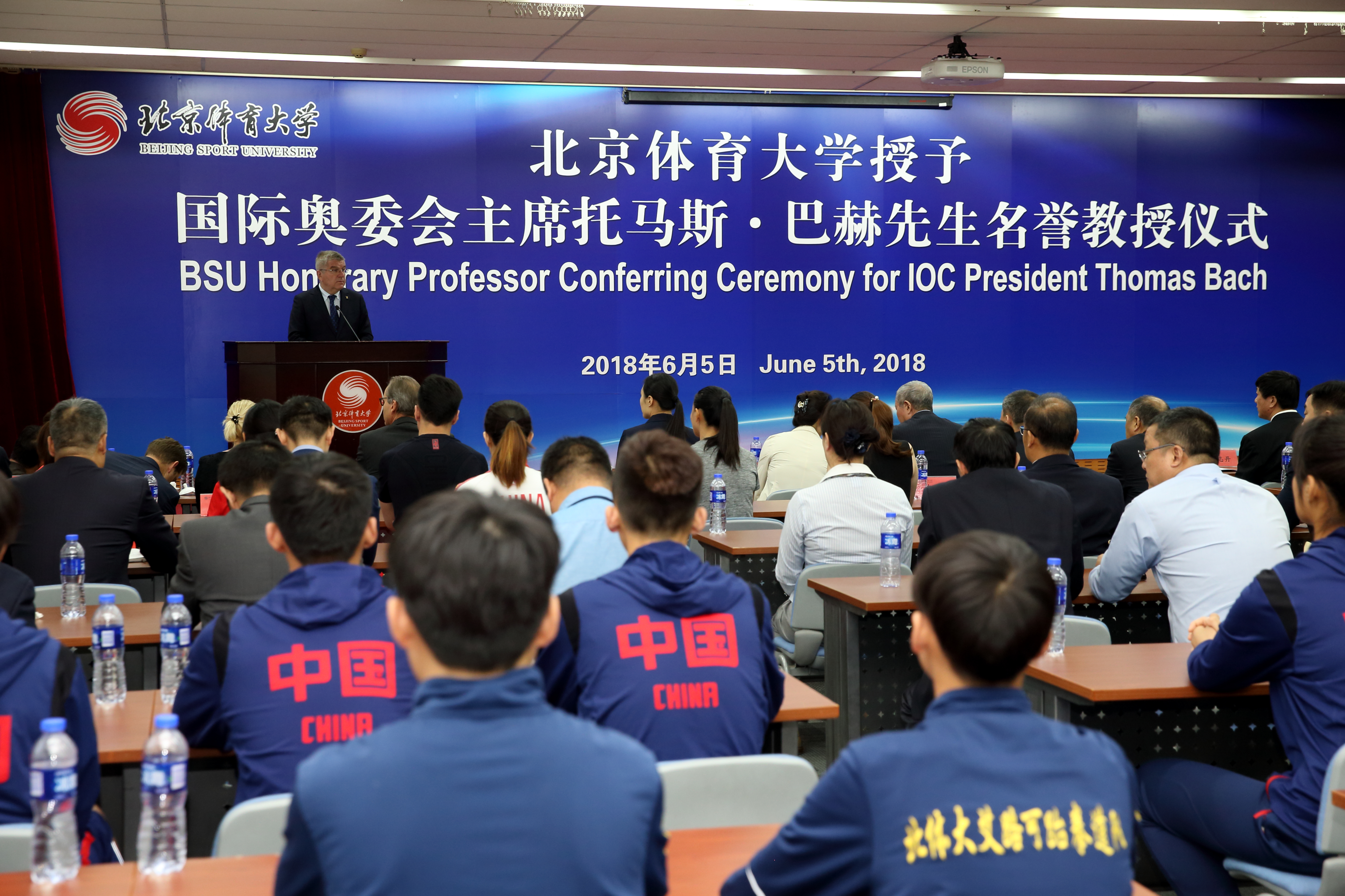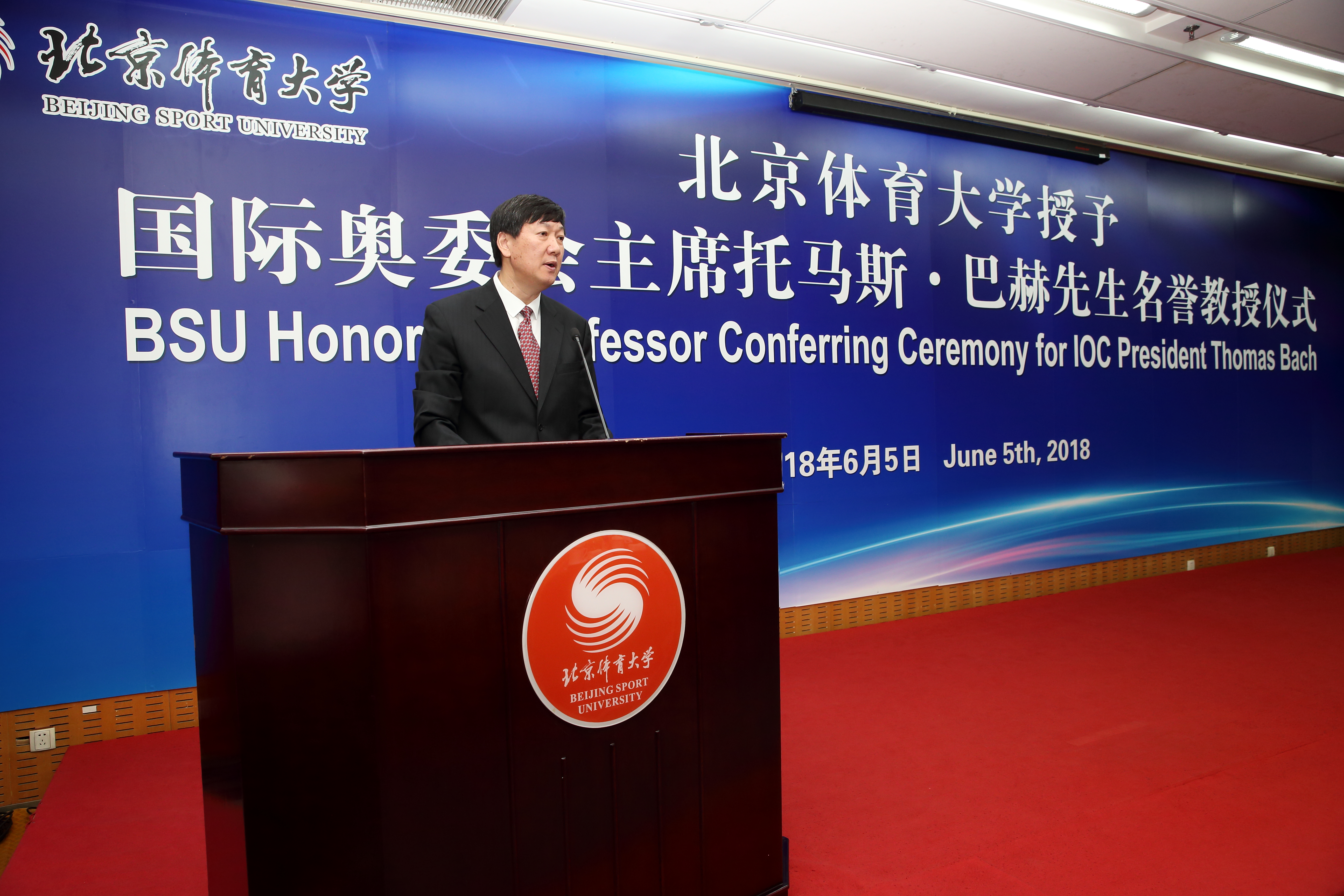 6月5日,game365打不开授予国际奥委会主席托马斯·巴赫先生名誉教授仪式在game365打不开国家队训练基地举行。国际奥委会主席托马斯·巴赫,国际奥委会副主席、中国奥委会副主席、北京2022年冬奥会和冬残奥会组织委员会副主席于再清,国际奥委会委员、中国奥委会副主席李玲蔚,国际奥委会委员张虹,国家体育总局党组成员、副局长高志丹,总局相关司、局领导出席授予仪式。game365打不开全体在校领导、相关职能部门和学院负责人,奥运冠军、学生代表参加了本次活动。game365打不开党委书记曹卫东主持授予仪式。
