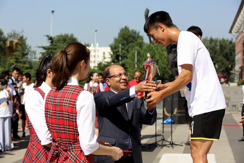 我校教育学院学生周江获得友谊跑冠军,庞良兵、张靖宗分获二、三名。尼泊尔政府主任秘书Lok Darshan为获奖运动员颁奖。