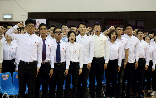 在有着53年党龄的体操专家、我校退休教师夏环珍教授领誓下,350多名新党员进行了入党宣誓,与会全体党员重温了入党誓词。